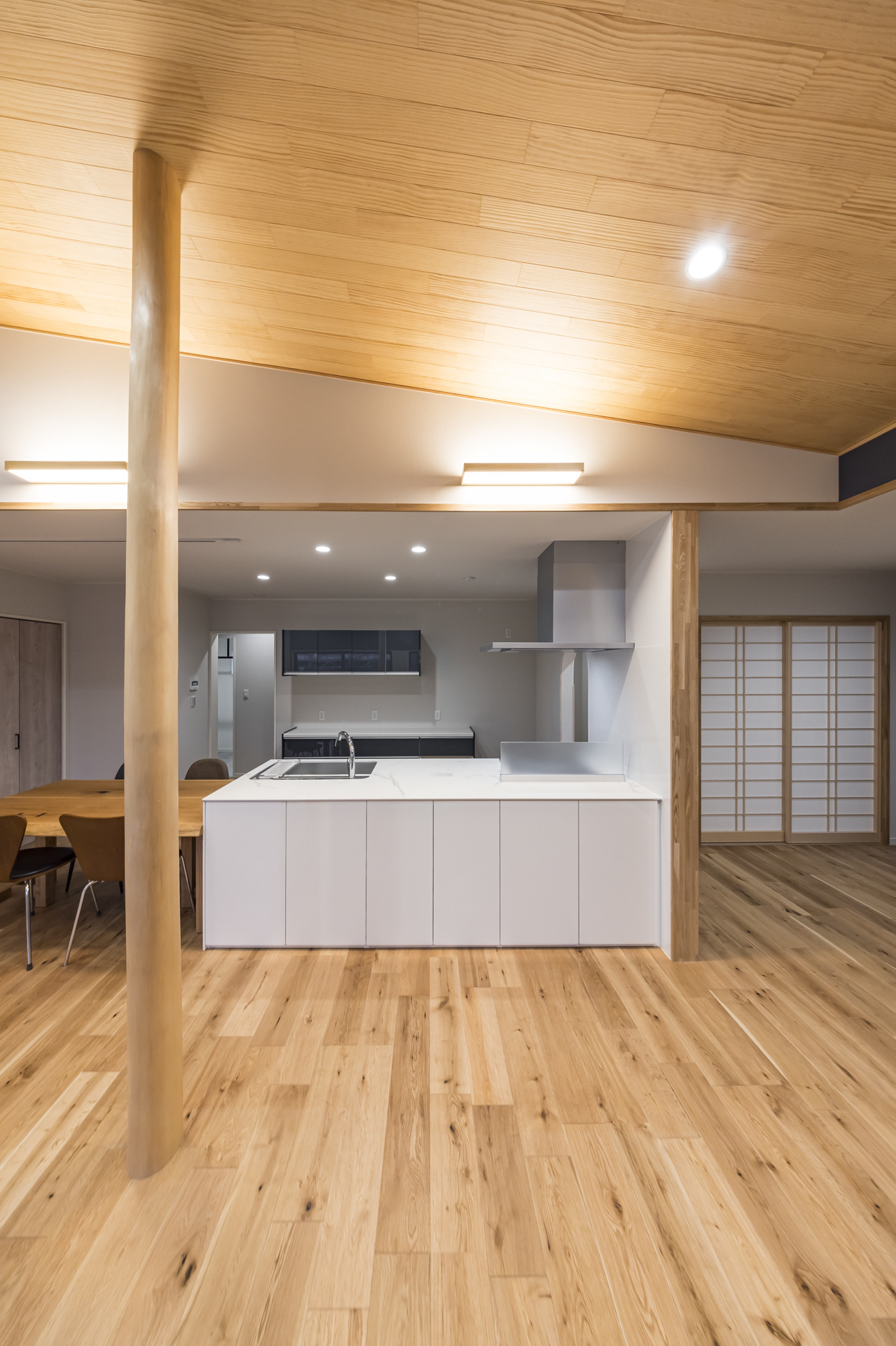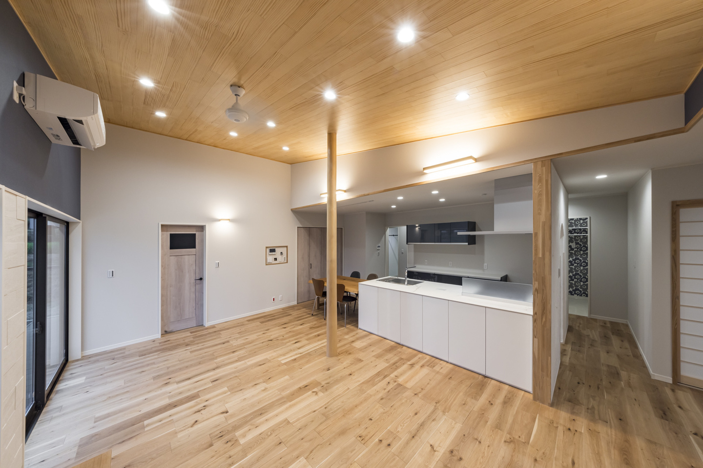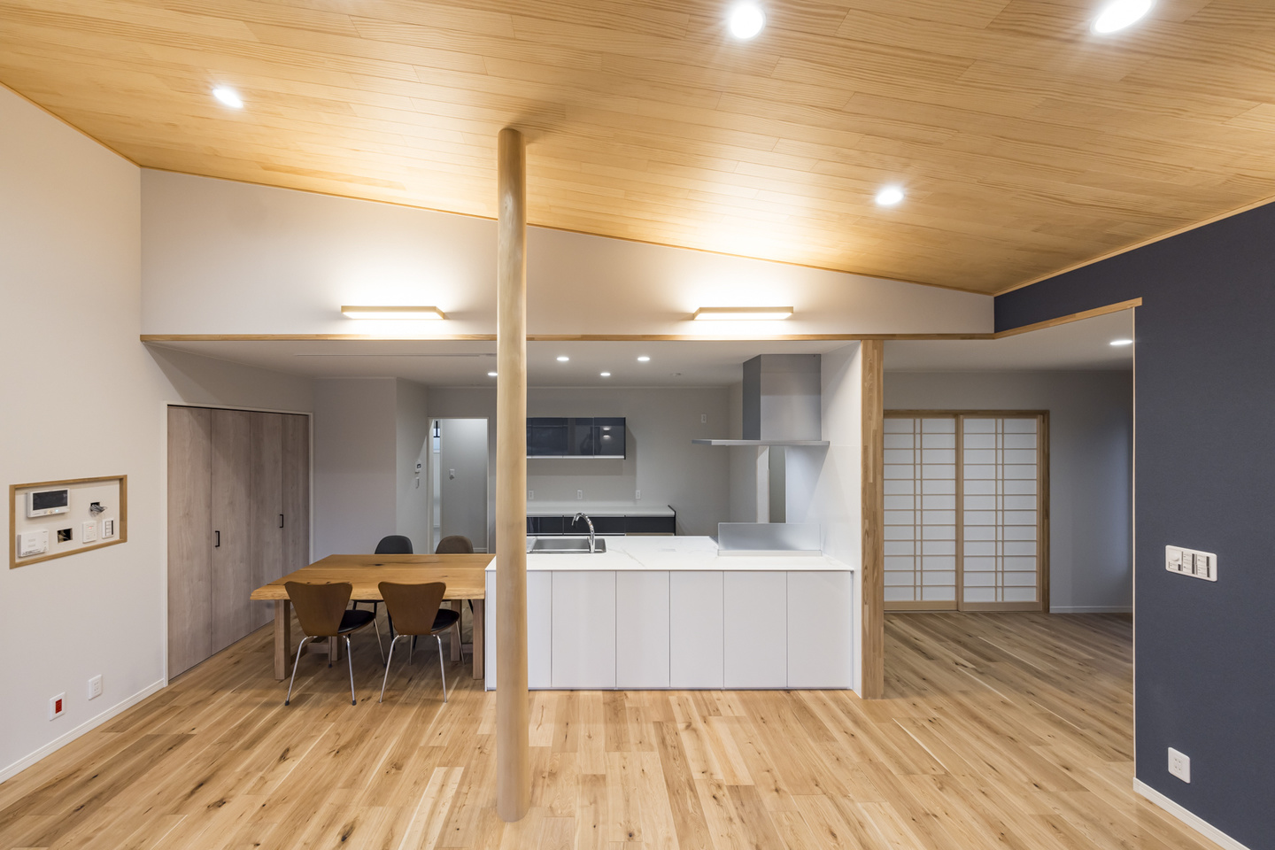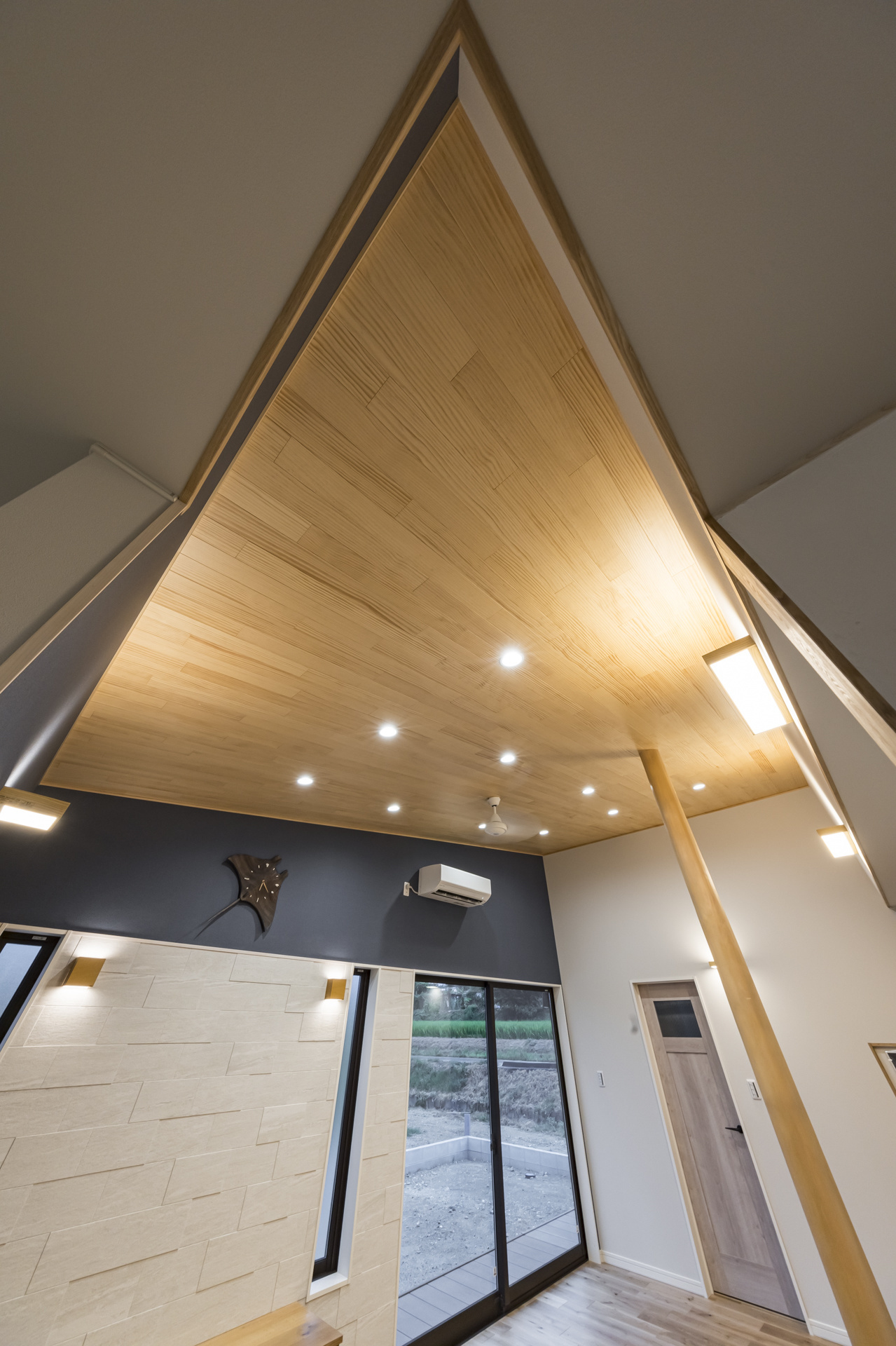 寝室、リビングから繋がるウッドデッキもあり、すべてのフロアーが繋がる生活しやすい回遊動線になっています。大空間の勾配天井でより広さを感じます。