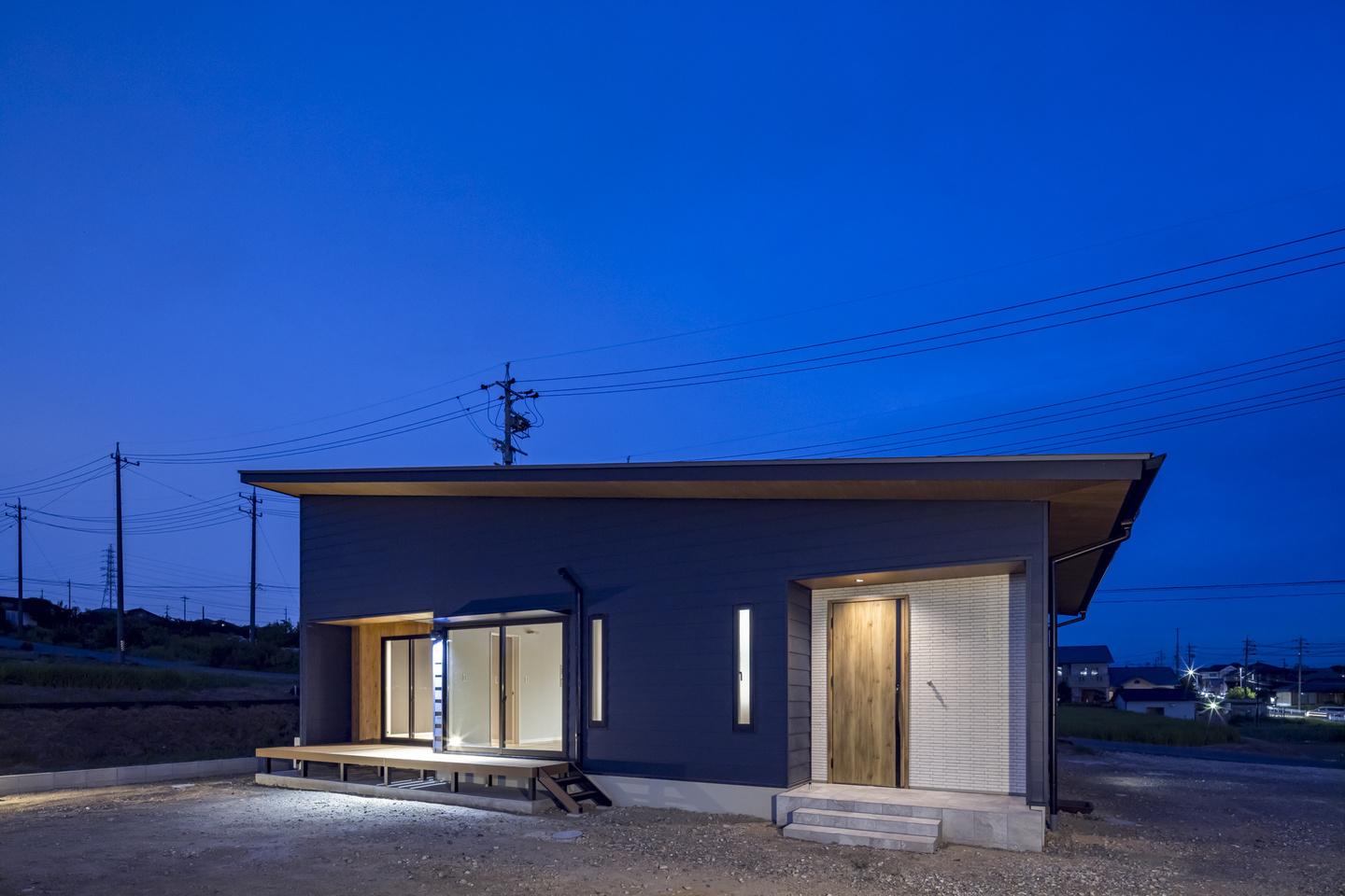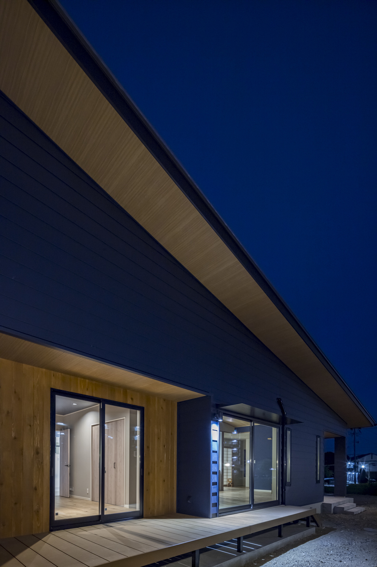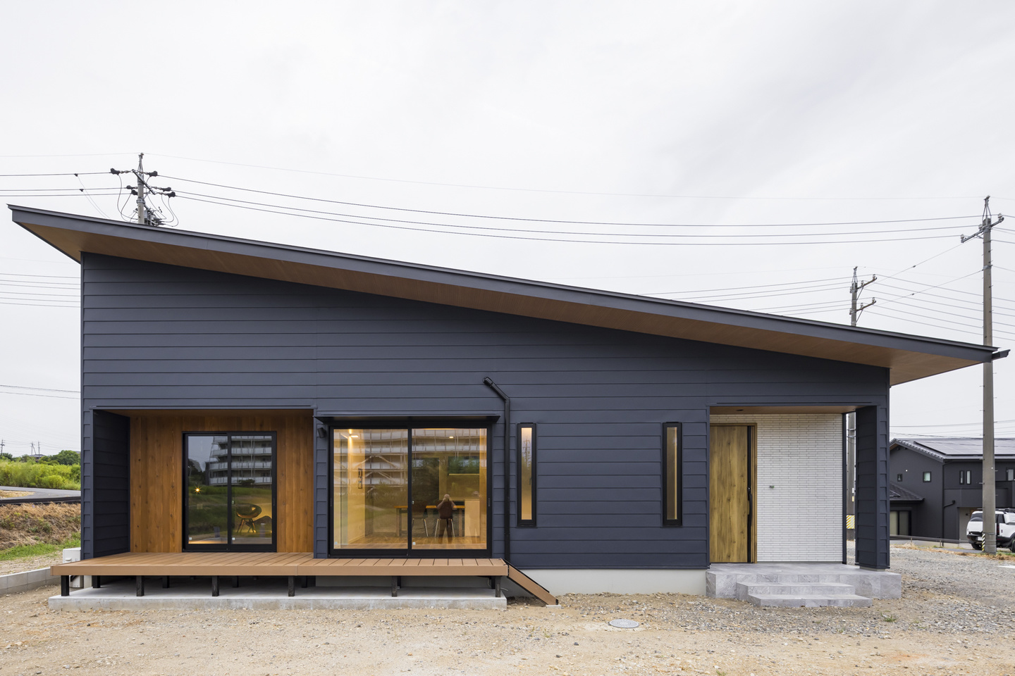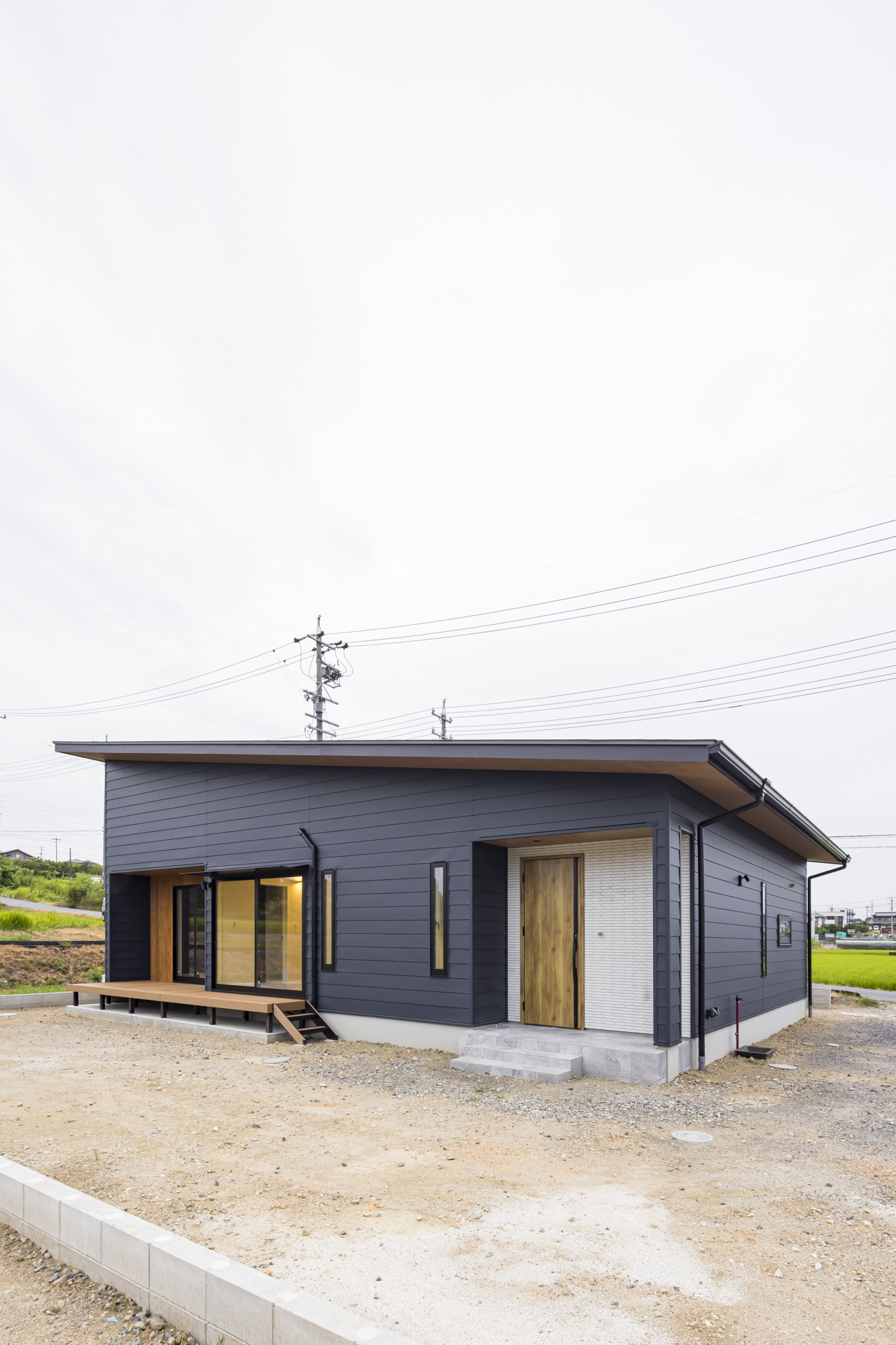 外壁はネイビーのガルバリウム鋼板を横張りに仕上げ、シンプルで重厚感のあるデザインに。自然災害に強い一枚屋根の平屋で、安心して暮らせる住まいを実現しました。