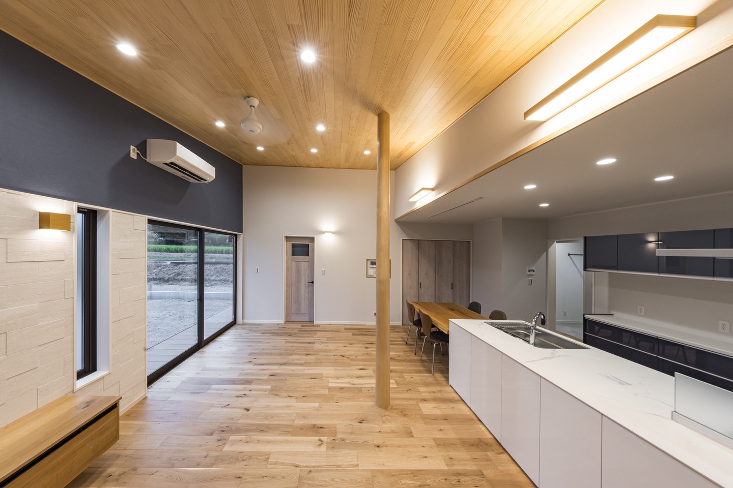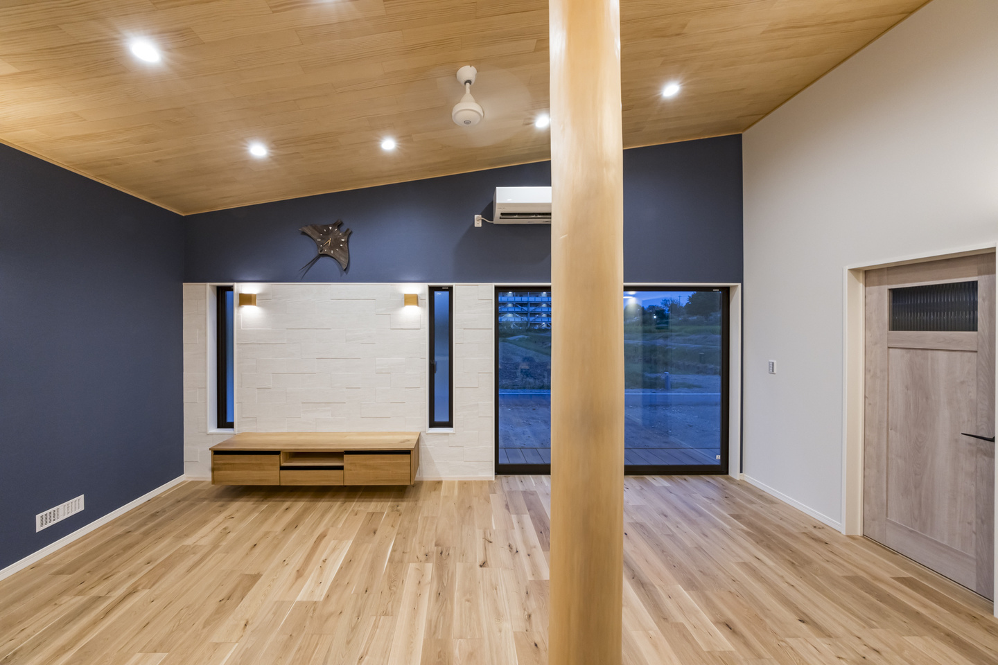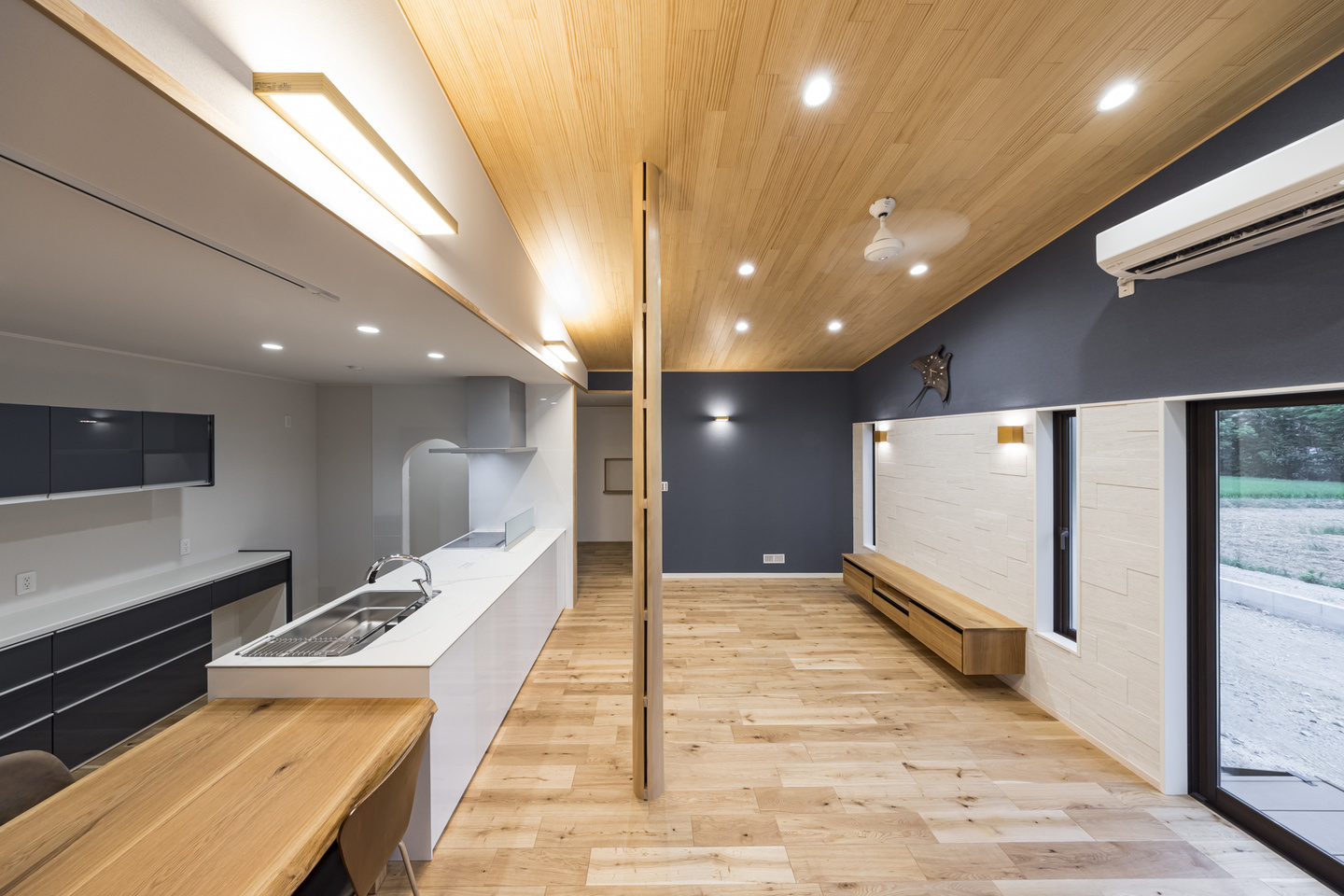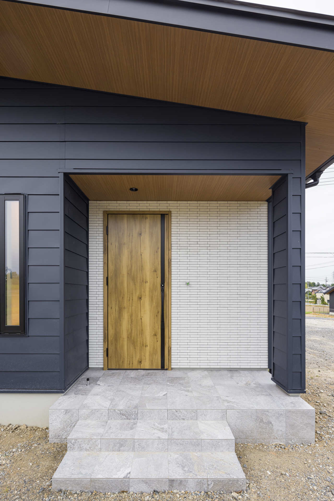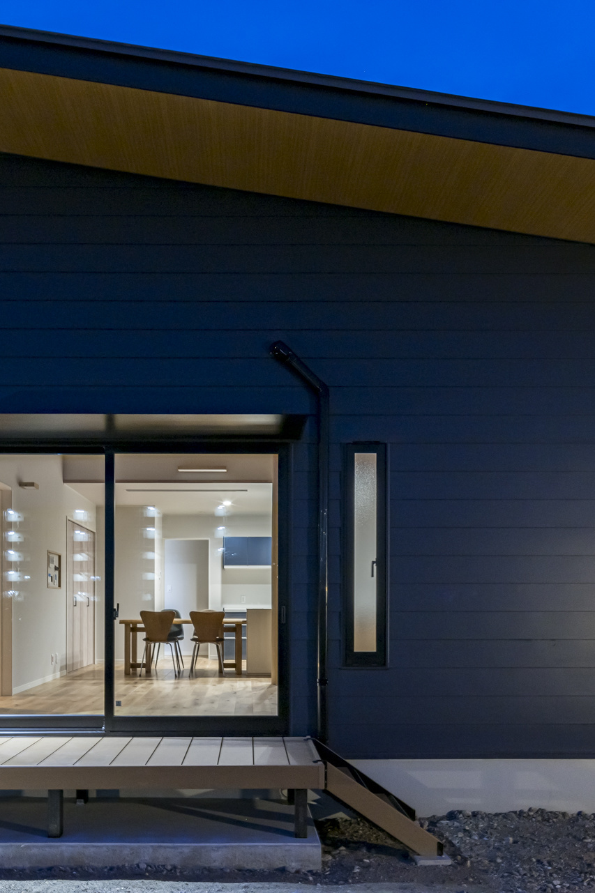 外壁はネイビーのガルバリウム鋼板を横張りに仕上げ、シンプルで重厚感のあるデザインに。自然災害に強い一枚屋根の平屋で、安心して暮らせる住まいを実現しました。
