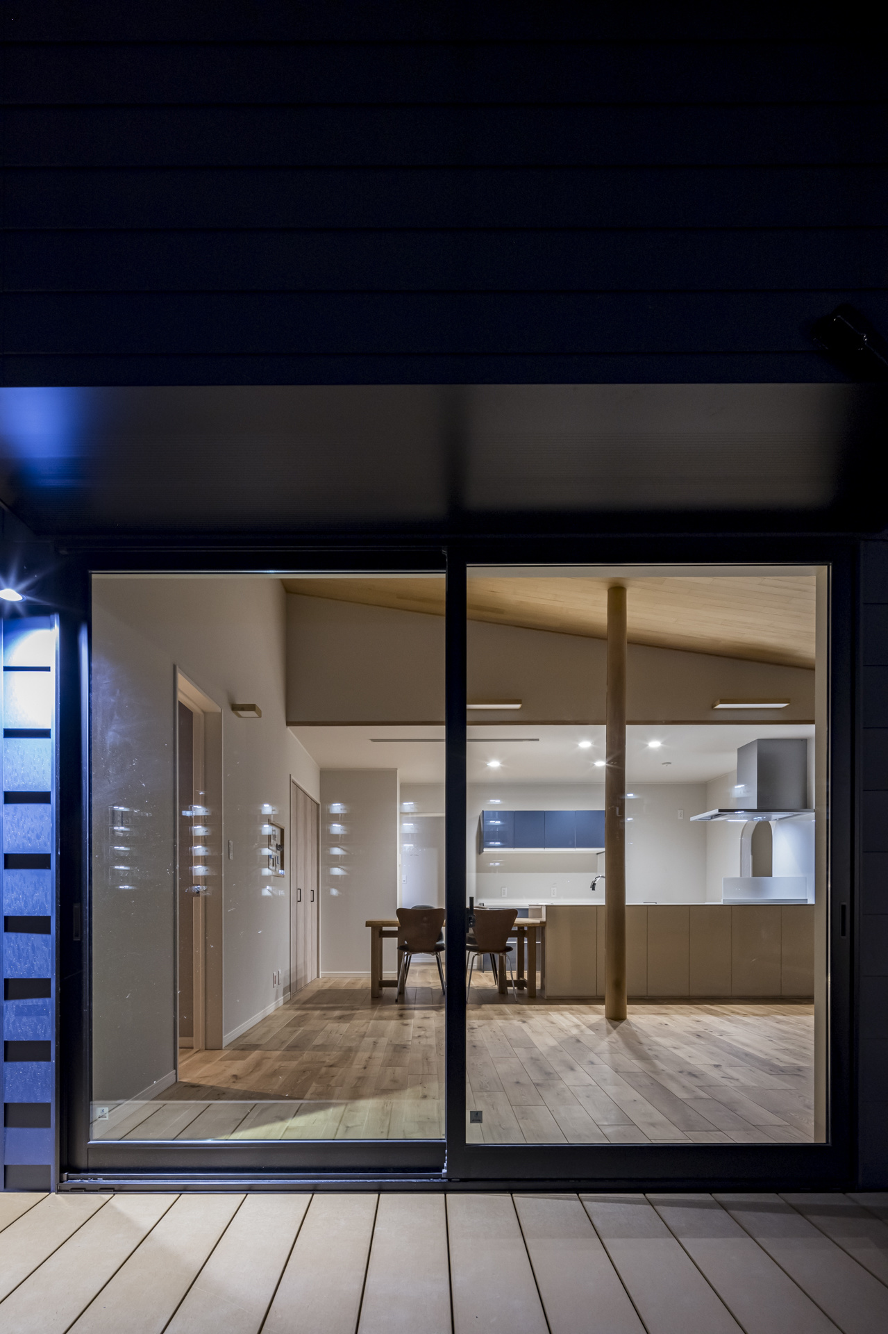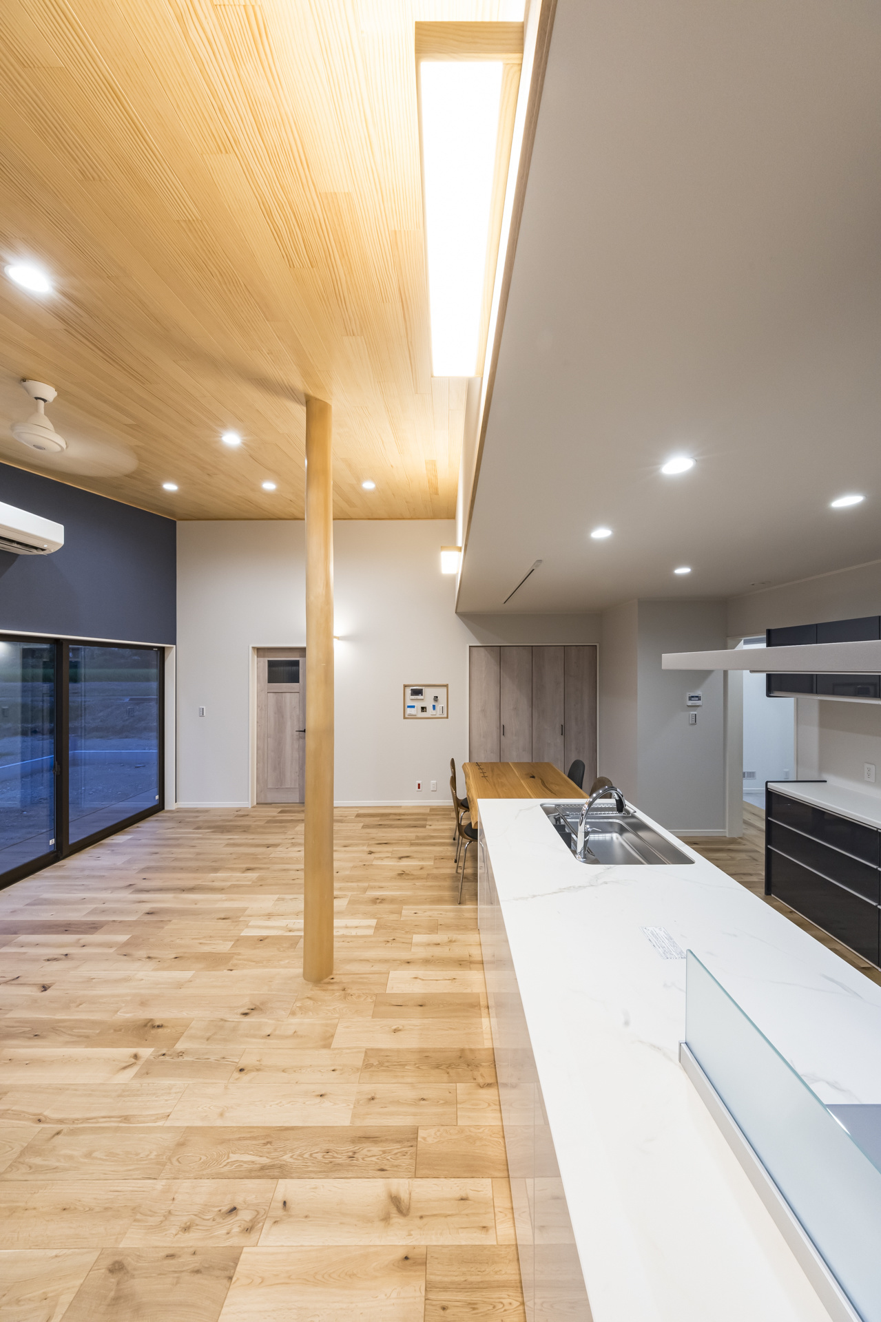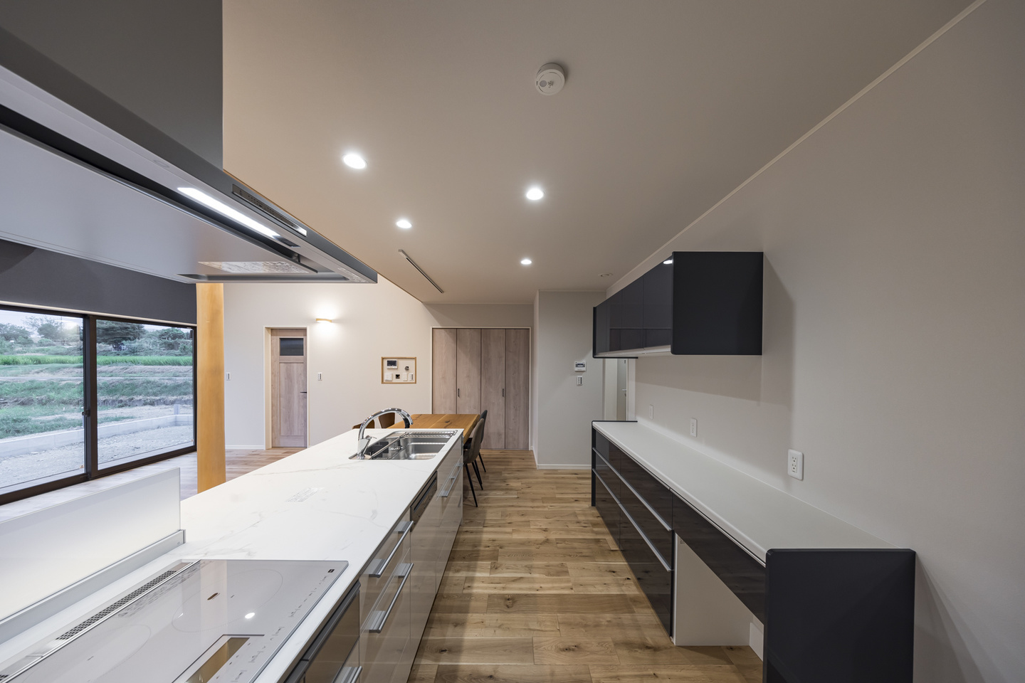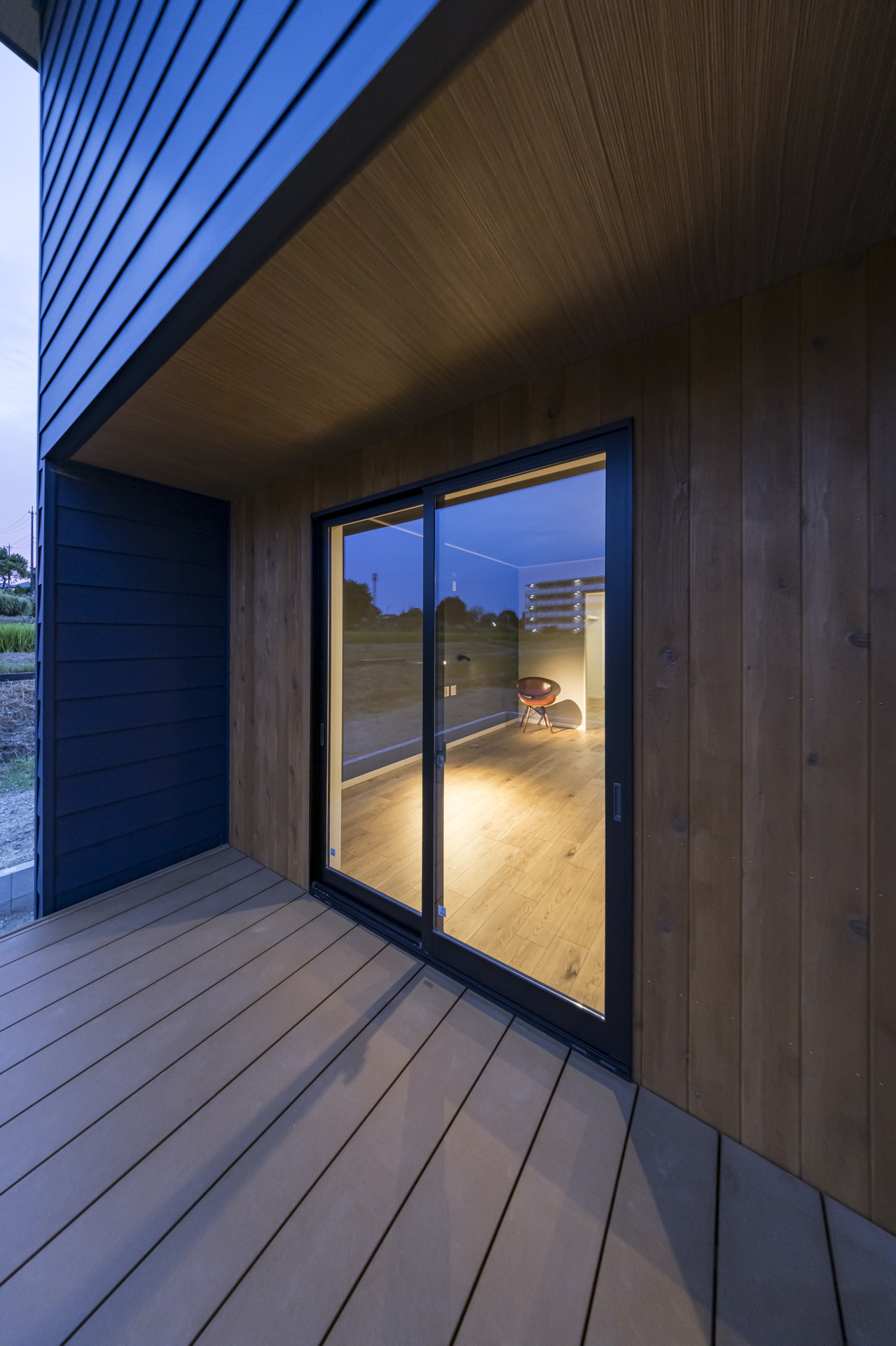 外壁はネイビーのガルバリウム鋼板を横張りに仕上げ、シンプルで重厚感のあるデザインに。自然災害に強い一枚屋根の平屋で、安心して暮らせる住まいを実現しました。
