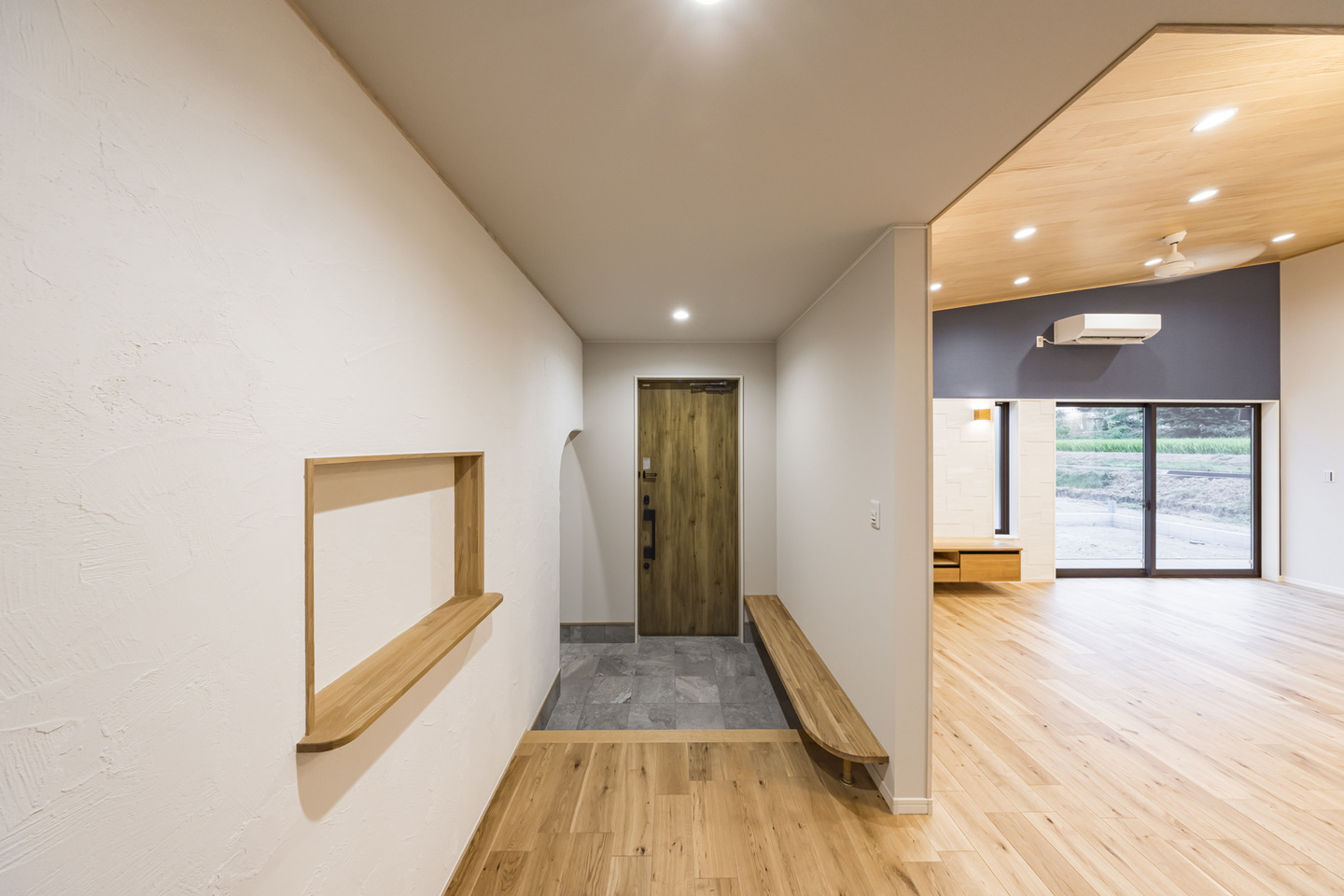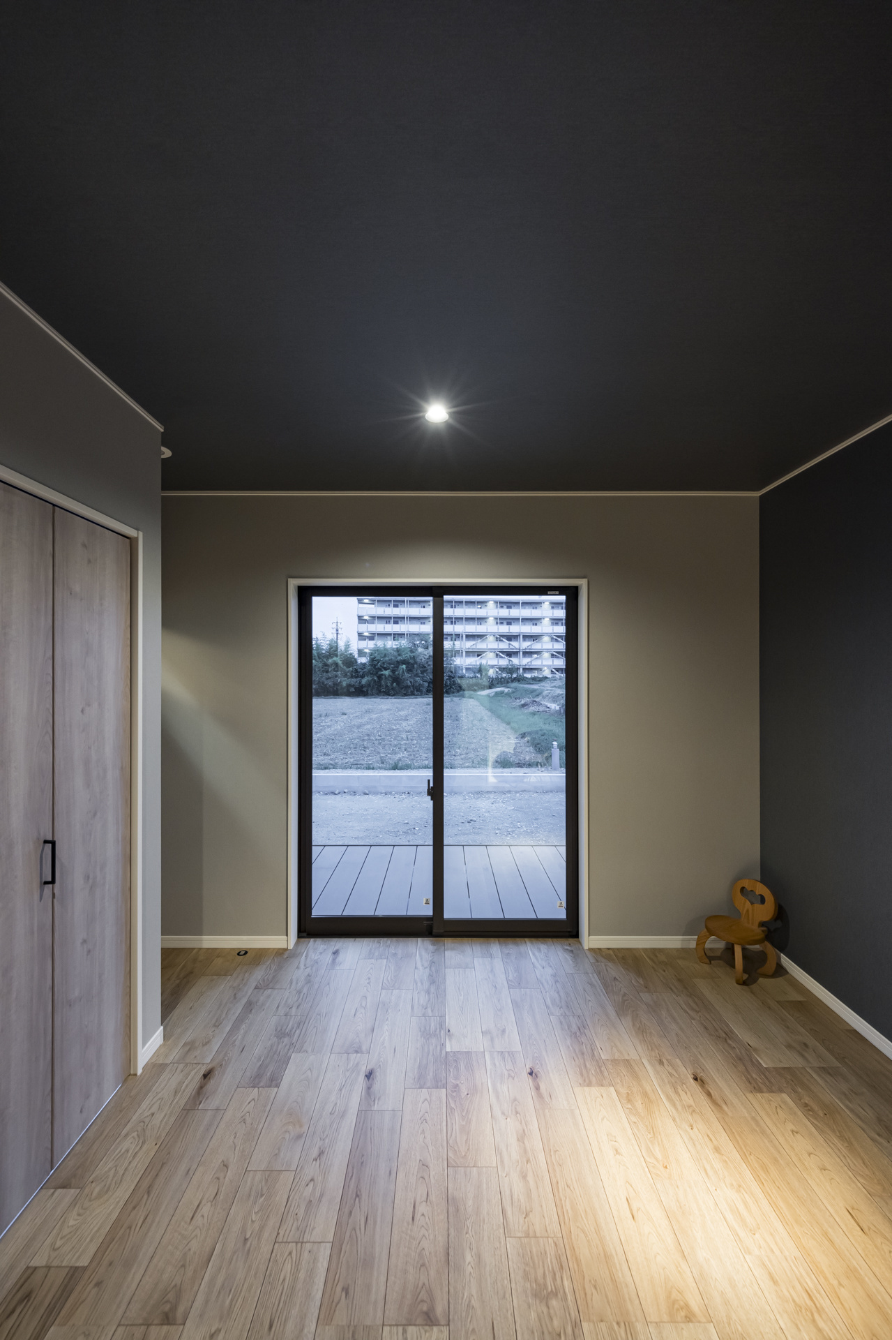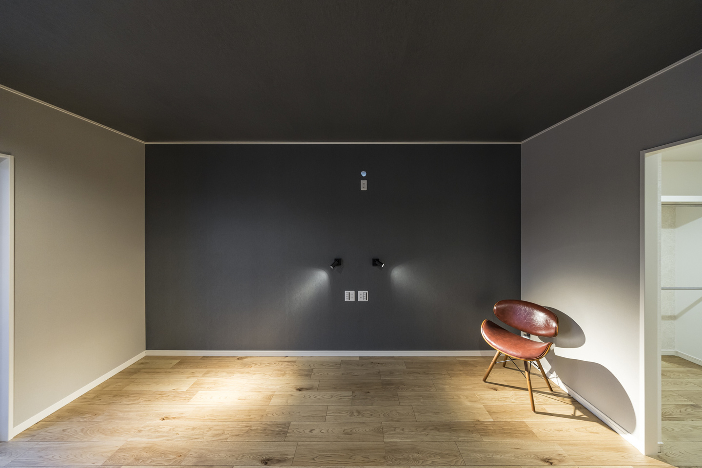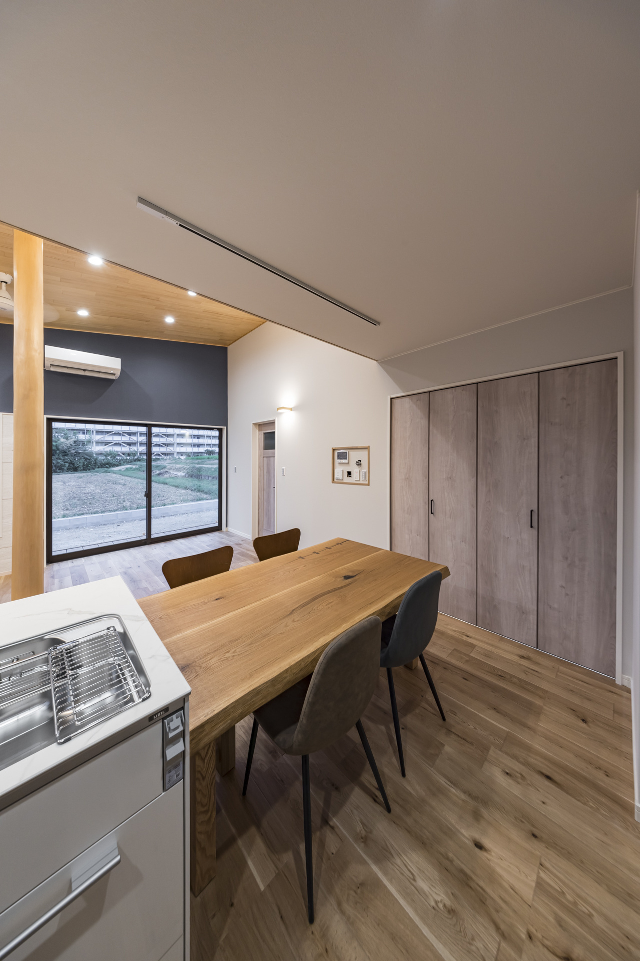 外壁はネイビーのガルバリウム鋼板を横張りに仕上げ、シンプルで重厚感のあるデザインに。自然災害に強い一枚屋根の平屋で、安心して暮らせる住まいを実現しました。