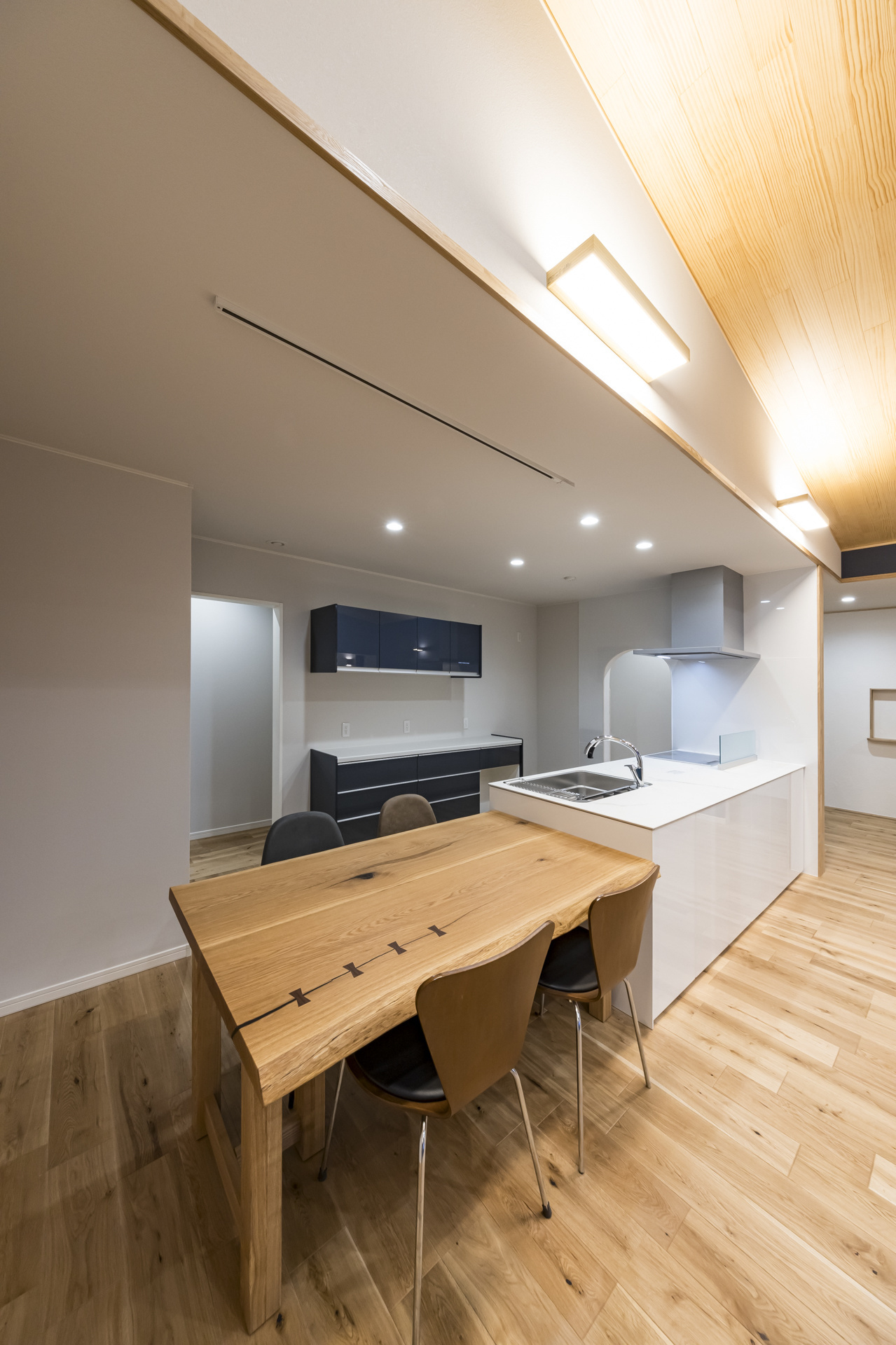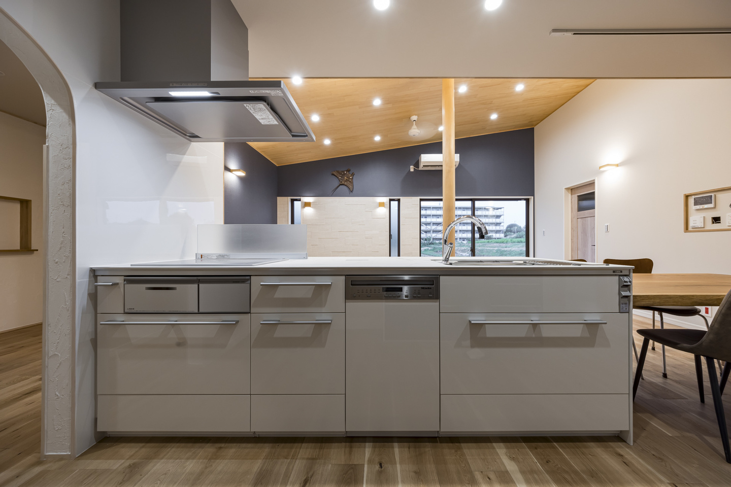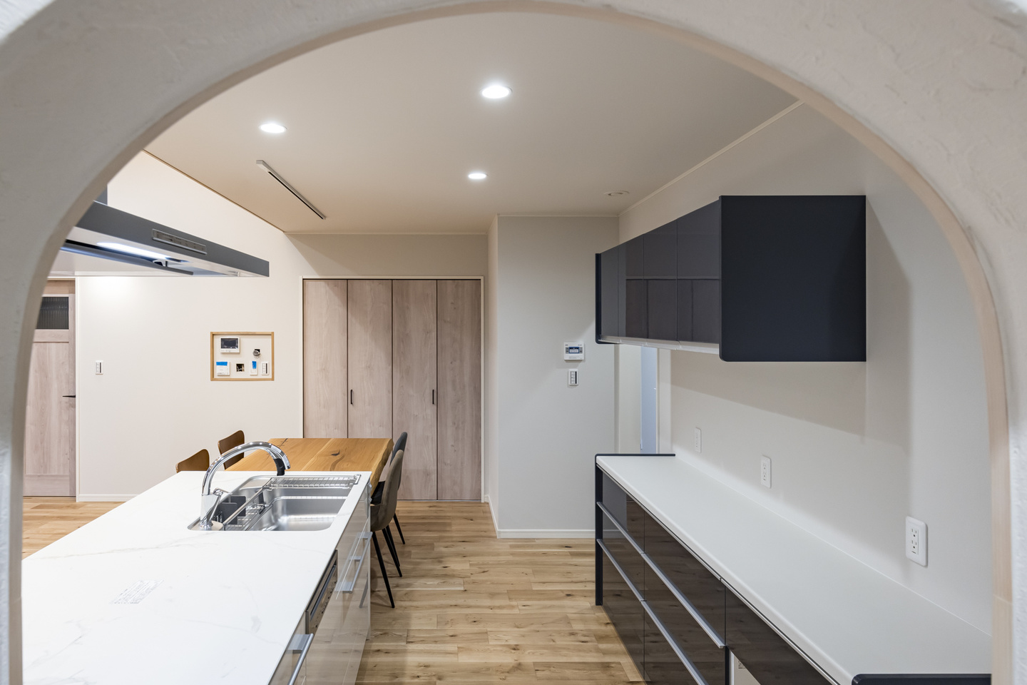 リビングダイニングには一枚無垢のテーブルがあり、TVボードは一面のエコカラット壁になっており、キッチンにはスイスの漆喰で仕上げたアーチ型の入口が特徴的です。